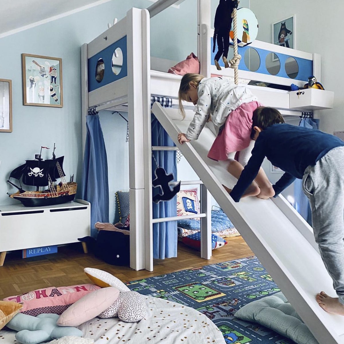 Los muebles de la colección Deluxe de Breuyn pueden ajustarse a diferentes alturas infinitamente sin problemas. Destacamos que todos los elementos que la conforman, desde las escaleras hasta la protección contra caídas, están diseñados como un elemento de juego para fomentar la imaginación y la creatividad de vuestros hijos.